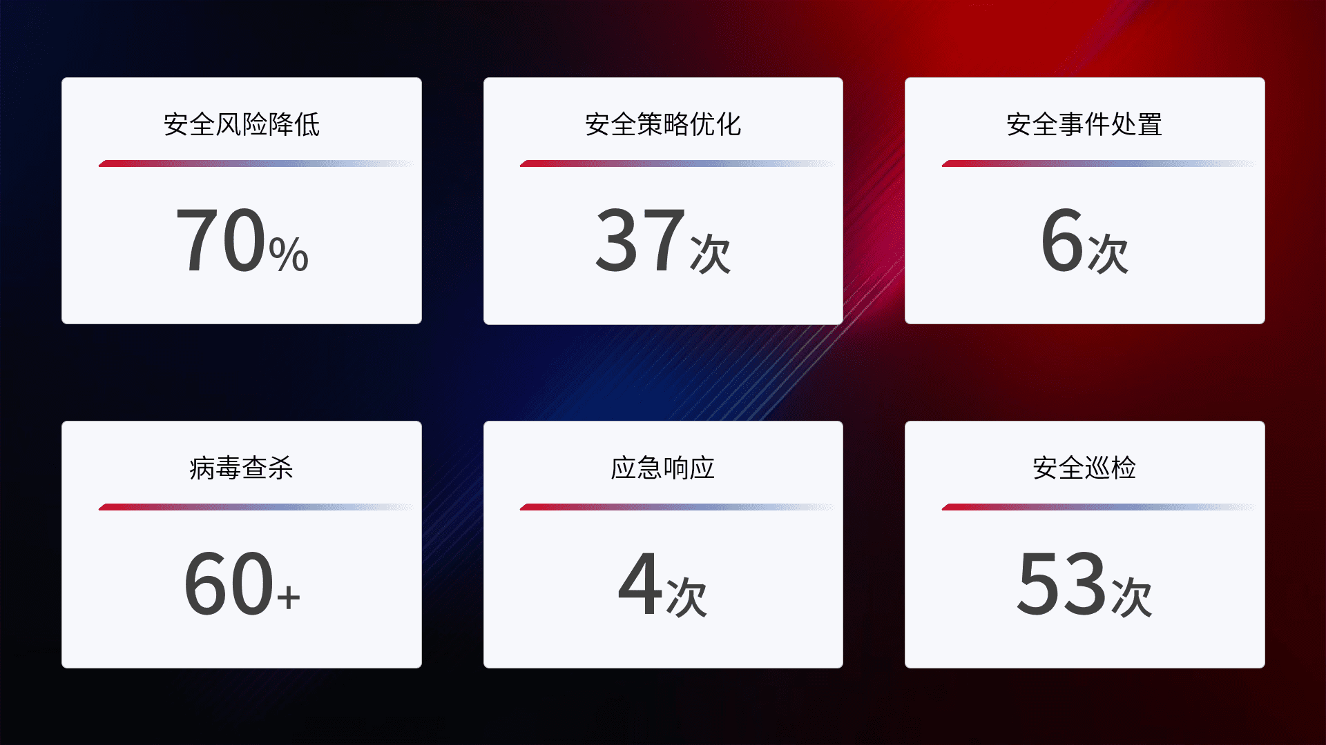 提供全面的安全事件报告体系,,,包括处置报告、、周报、、季度和年度总结,,,结合持续监控,,,帮助客户深入了解网络安全状况。。
