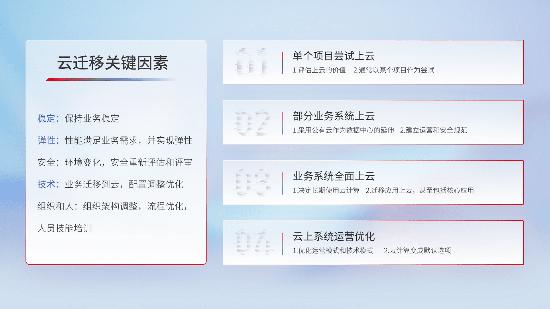 结合实际业务,,从规划设计、、、云平台选型、、、云原生改造、、、、数据迁移、、集成交付,,,迁移全过程为客户识别最佳上云路径,,,做好风险识别管理,,,,设计网络架构、、身份权限、、、安全审计合规、、、、操作审计、、、日志审计、、、监控告警策略、、、、多站点容灾设计等,,,,对云上基础设施进行整体规划,,提升IT治理水平,,以满足弹性、、、、高可用、、、、高性能的需求。。。