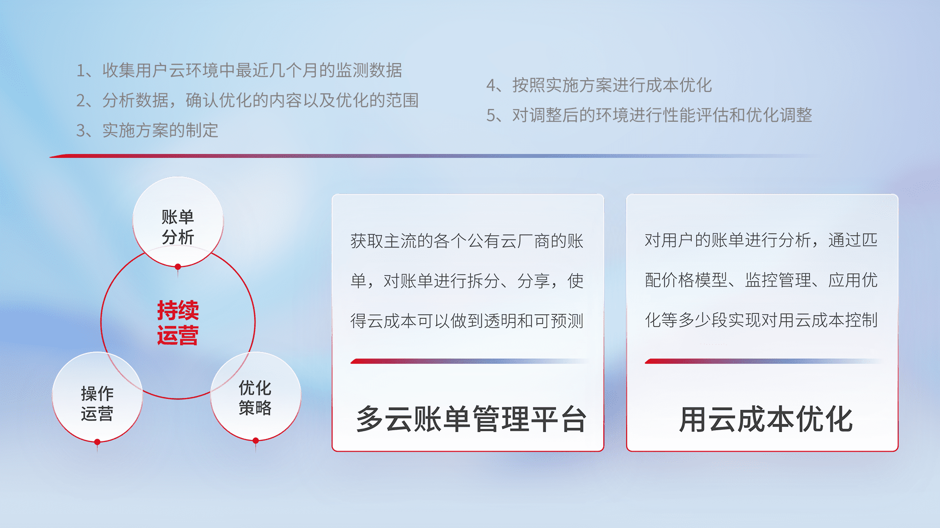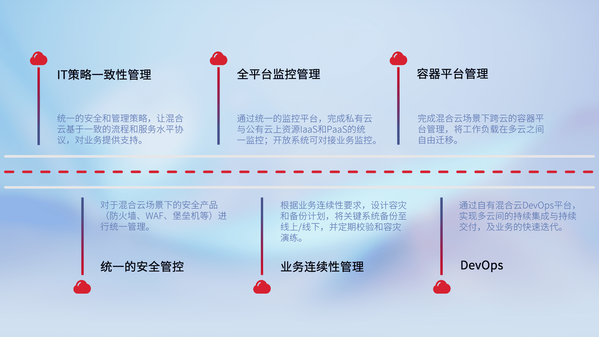 通过多云纳管,,以统一的资源数据模型把客户的云资源进行抽象和封装,,,,进而实现对多云资源的统一操作,,保障云资源管理的可靠性、、、稳定性与可用性。。。量身定制化运维内容,,,,配置、、、开发运维、、、、补丁管理、、、备份、、、监控、、认证和访问管理、、、、审计和日常巡检等,,,保障在用云过程中的可靠度,,稳定度以及高可用率。。。