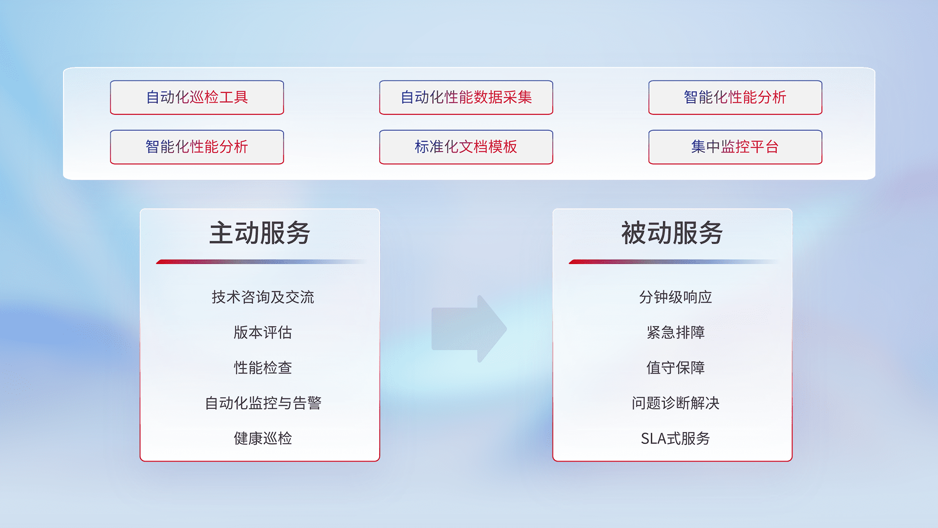 智能化工具和标准化文档,,,保障服务质量,,,提供主动服务(包含技术咨询、、、、版本评估、、、、性能检查、、、自动化监控与告警、、、、健康巡检)和被动服务包含(分钟级响应、、、紧急排障、、、、值守保障、、问题诊断解决、、、SLA服务)。。。